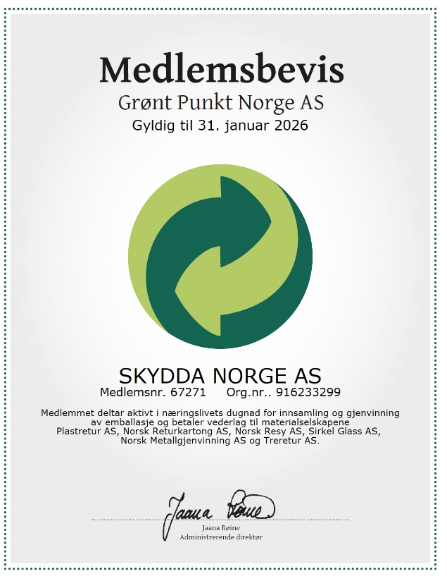 Mål: Som medlem i Grønt Punkt Norge tar Skydda Norge ansvar for alle emballasjetyper gjennom retursystemer godkjent av Miljødirektoratet.