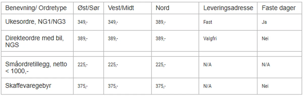 Frakttabellen gjelder alltid ved avvikende leveringsadresser.