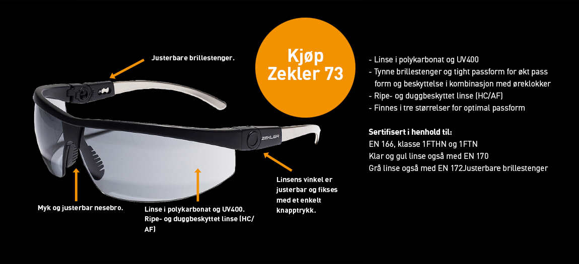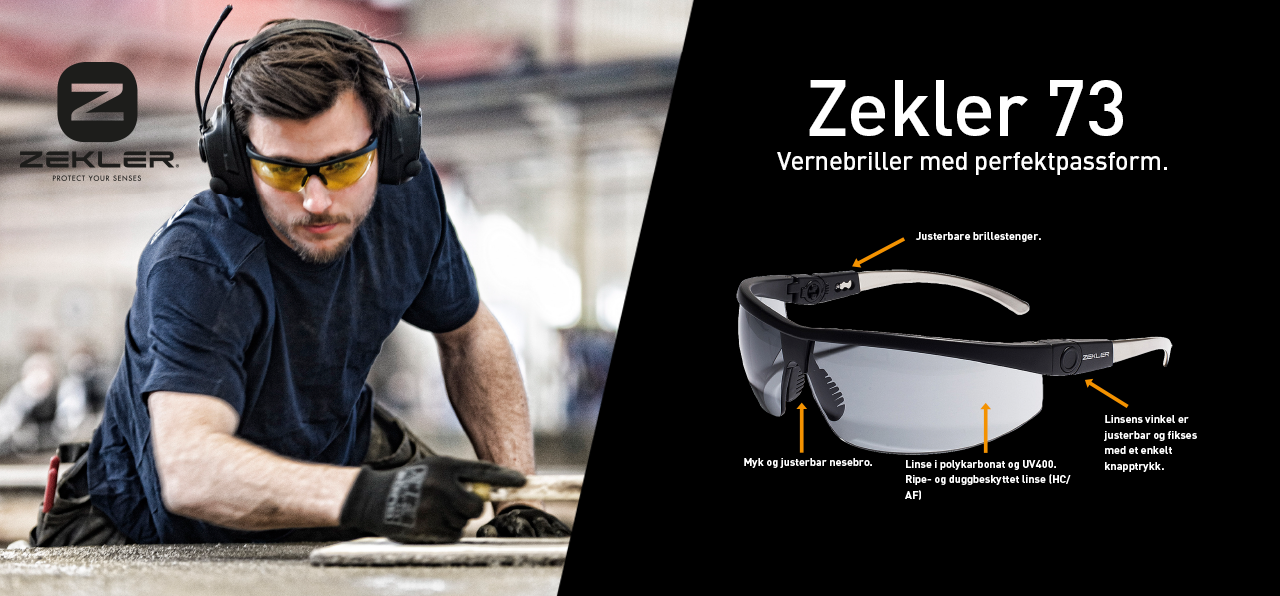 Zekler har laget vernebrillen Zekler 73, en fleksibel, lett og justerbar vernebrille i stilrent design med tynne brillestenger. Brillen kommer i 3 ulike modeller, klar, gul- og grå linse. Brillene fåes i størrelsene small, medium og large og har justerbare brillestenger og nesebro.