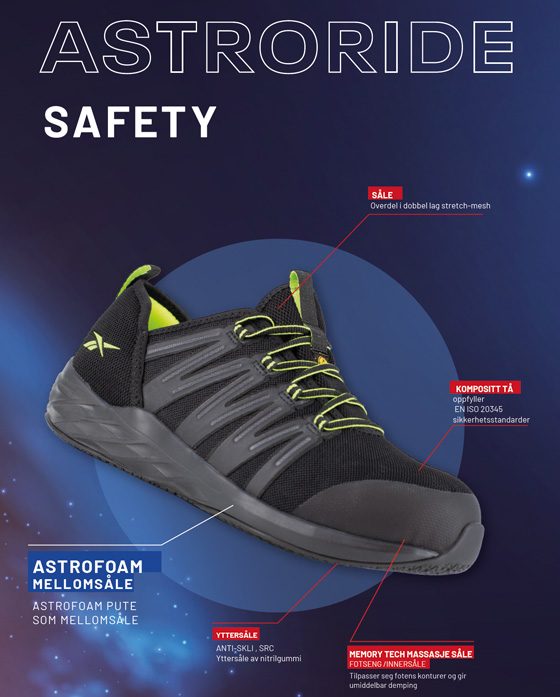 Gir enestående demping takket være Astrofoam mellomsålen. Slitesterk yttersåle i nitril garanterer langvarig ytelse, og med en bred passform forblir skoen komfortabel gjennom hele arbeidsdagen. Den øvre delen av verneskoen er lagd med vannavstøtende Splashzone™-belegg, som holder føttene tørre. Utagbar og vaskbar MemoryTech-innersåle gir ekstra komfort.