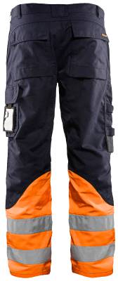 - Utvendige etiketter. Gylf med metallglidelås. Hemper, hvorav én med D-ring. Avtakbar ID-kortlomme for flammehemmende plagg. Skjulte knapper. Forsterkede baklommer med belg og klaff. Beinlomme med belg, telefonlomme og pennelomme. Beinlomme med klaff og trykknapp. Skrå innstikkslommer. Knebeskytterlommer. Utvendig lomme til knebeskytter. Forsterket tommestokklomme med knivholder og pennelomme.