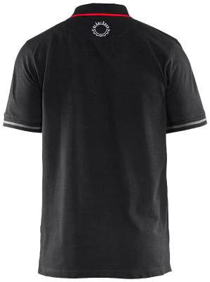 Halsåpning med knapper. Ribbestrikket krage. Vevd etikett nederst foran. Blåkläder-broderi. Påsydd merke på armen. Trykk på brystet. Splitt i siden.