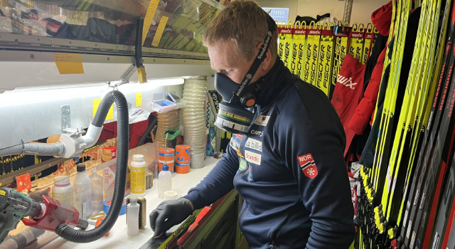 - Det som man også ofte glemmer, er svevestøvet som oppstår når man børster skiene. Her virvles og varmes gliderproduktene opp på nytt, og støvet er så ekstremt fint, tilnærmet usynlig. Støvet blir hengende i luften lenge og pustes inn lenge etter at man er ferdig med selve skiene. Dette er faktisk så alvorlig at hvis løpere selv gjør denne jobben kvelden før - eller samme dag - som et renn, kan det føre til at man får problemer med å yte maksimalt. Svevestøvet legger seg i klær, mat og bager, og er like helsefarlig der, så det er kjempeviktig å holde disse tingene unna der du smører og børster.